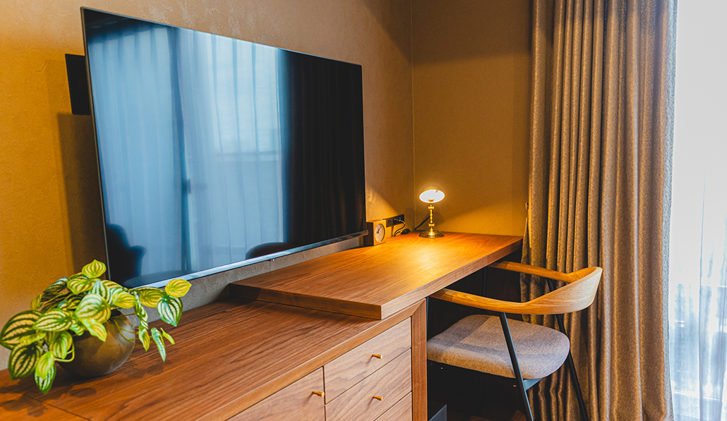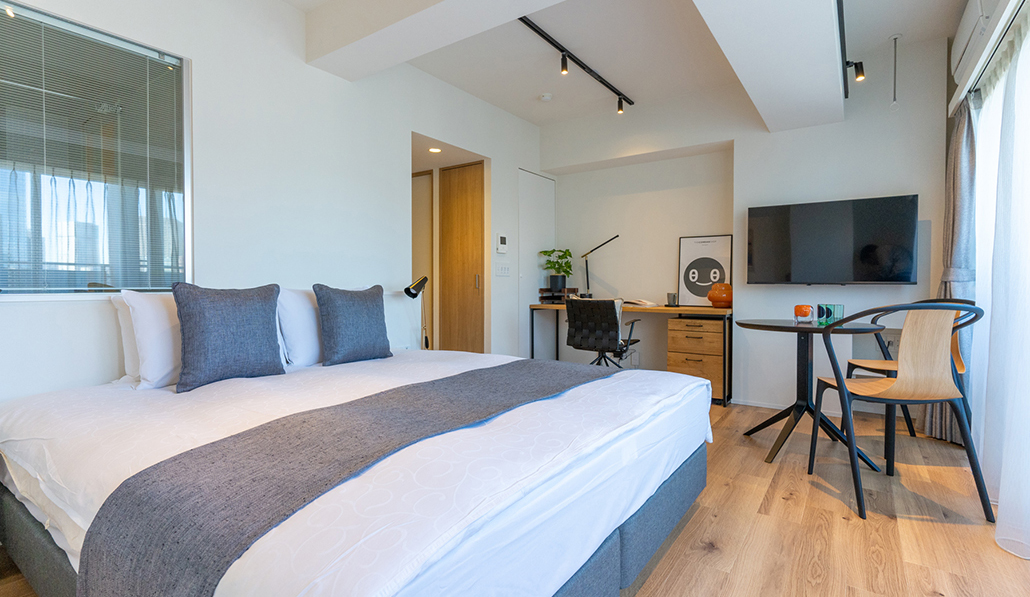 ハウスキーピング週3回、朝食無料サービス。ダイニングエリアが広く、55型高画質スマートTVや180㎝幅のキングベッドを完備。洗練されたインテリアのお部屋で、ホテル滞在のような快適さを感じて頂けます。